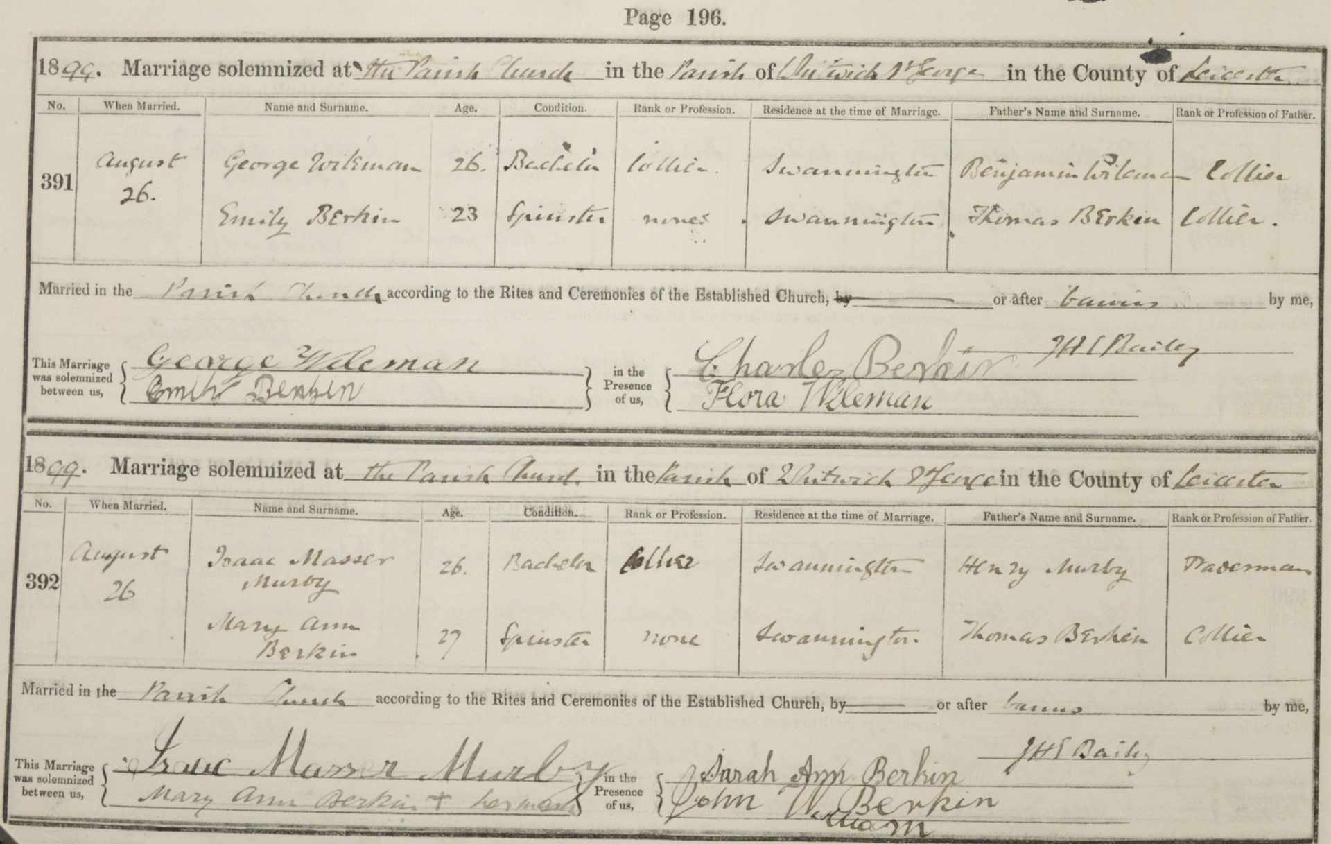 - 1891 The Common – Coal Miner Thomas Berkin 39, lived at Hoo Ash, Swannington (now the north side of Ashby Road, Coalville) with his wife Mary Ann 40 and children Thomas Henry 17, John 15, Emily 14, Charles 13, Frances 11 and William Kirby 8.